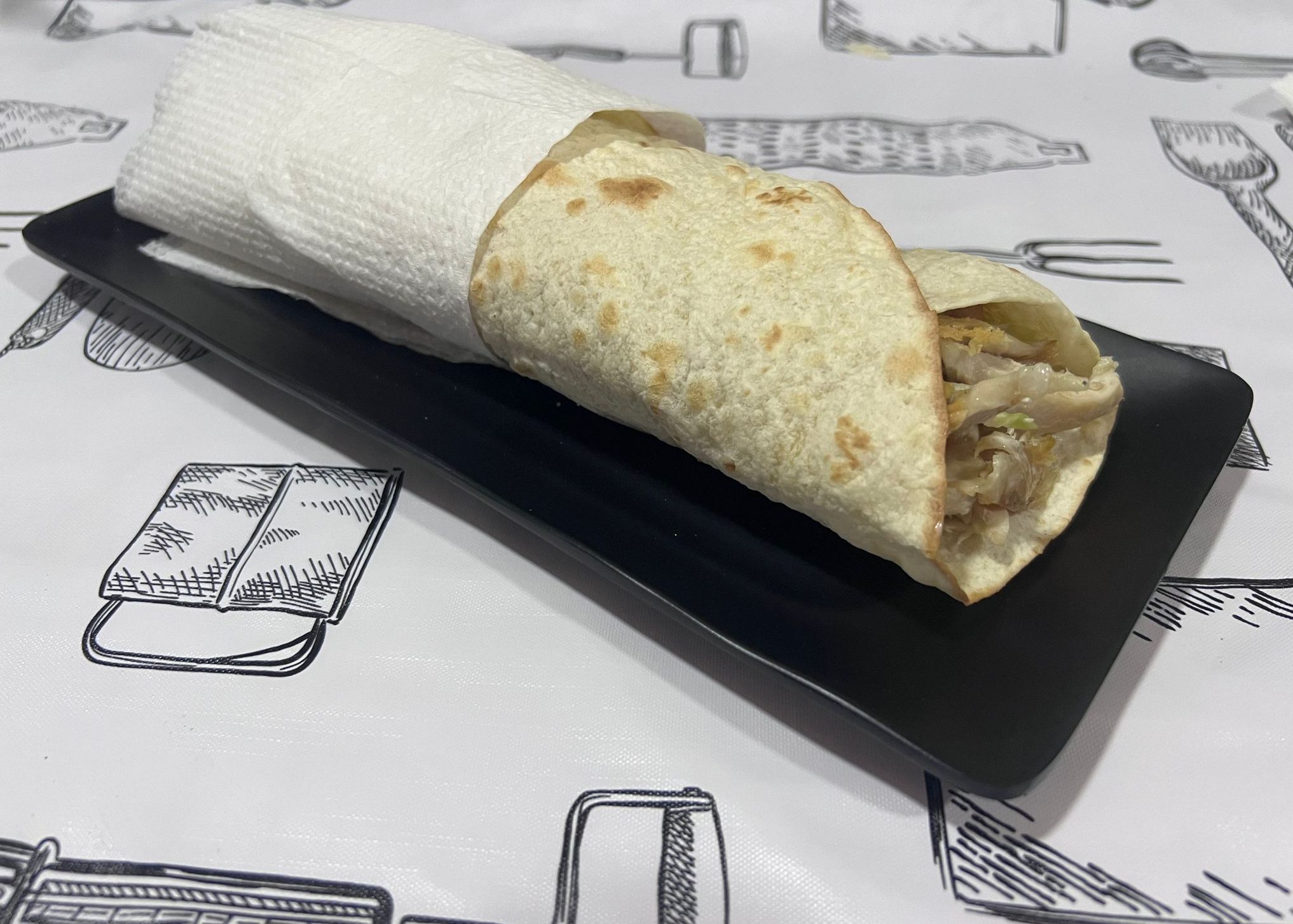 Pollo o ternera, tomate, lechuga y cebolla, salsa yogurt o picante.
